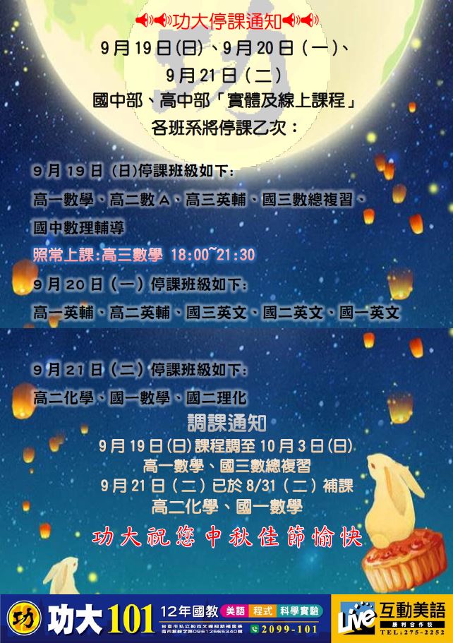 國中部、高中部「實體及線上課程」各班系將停課乙次