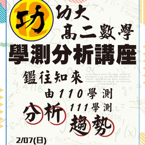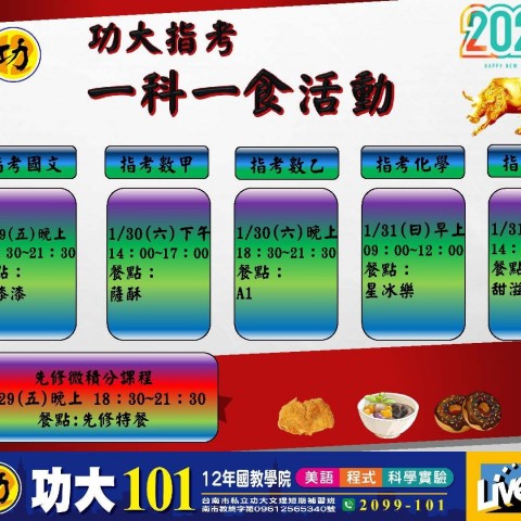 學測結束不可馬上鬆懈下來 ! 直到確定學校為止都還是戰爭 !! 為此,功大指考特訓班開訓啦~ 最強的師資,最完整的課程規劃, 讓你隨時處於備戰狀態。 指考各科講座活動於下週開跑: 1/25(一) 晚上 6:30 ~ 9:...