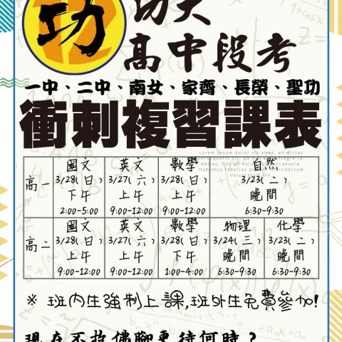 又到了高中段考周 同學們準備好了嗎? 功大幫還是沒準備周全的你 安排了各科大腿~ 班內生強制,班外生免費, 同學們~佛腳趕緊抱起來吧!