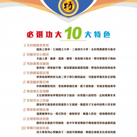 多益英語普及班 適合對象:國一~國三同學 11/07 (週六) 下午14:00~17:00 開放搶先試聽!! ◆ 當天只要來試聽…即可享有 麥當勞套餐 一份 ◆ 趕快帶國中同學和學弟妹一起來功大上課吧 功大 2020 多益秋季班...